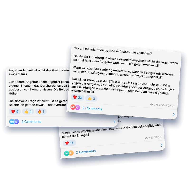 Den besten Effekt hat Circle, wenn du an den Live-Terminen teilnimmst, da du dir somit wirklich Zeit und Raum nimmst für deine Entwicklung. Wenn du an einzelnen Terminen verhindert bist, kannst du natürlich zu einem anderen Zeitpunkt die Aufzeichnung ansehen.